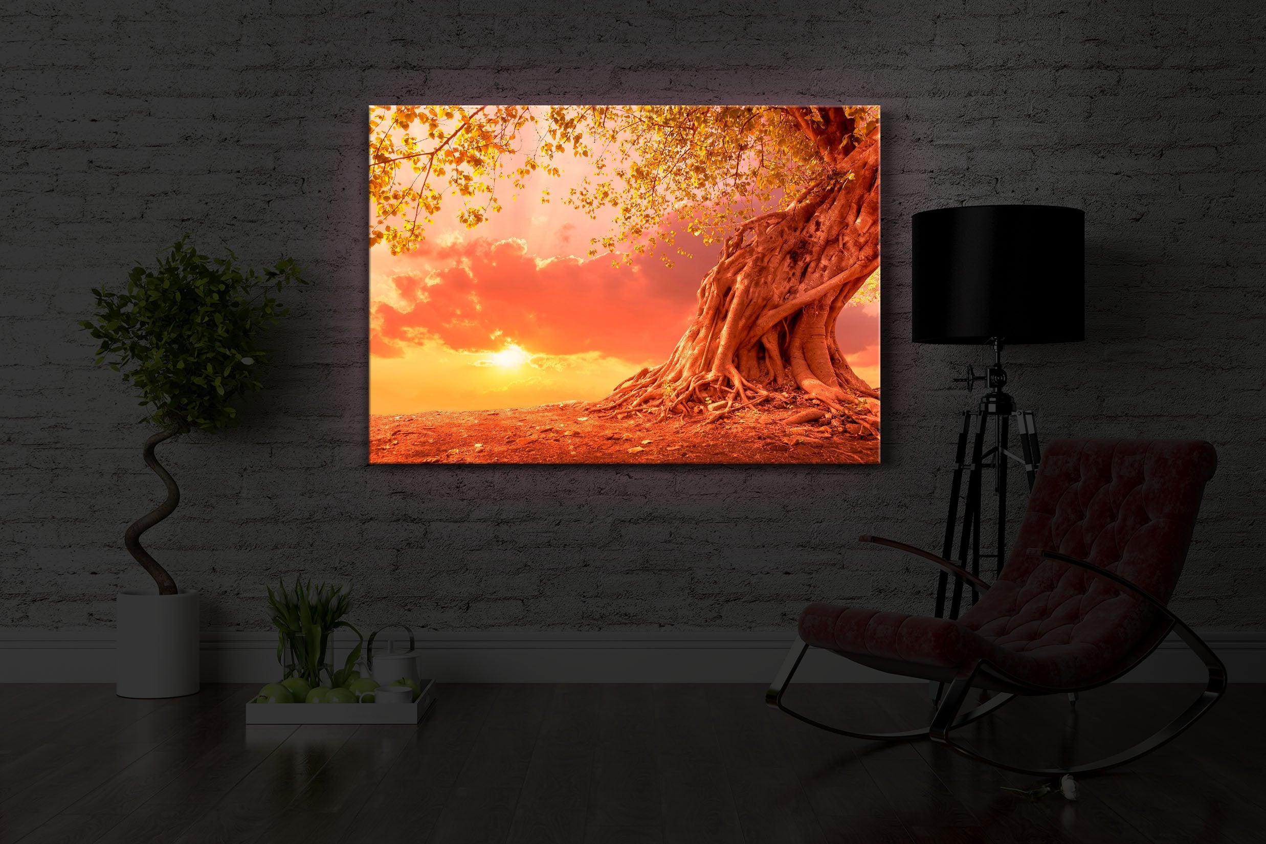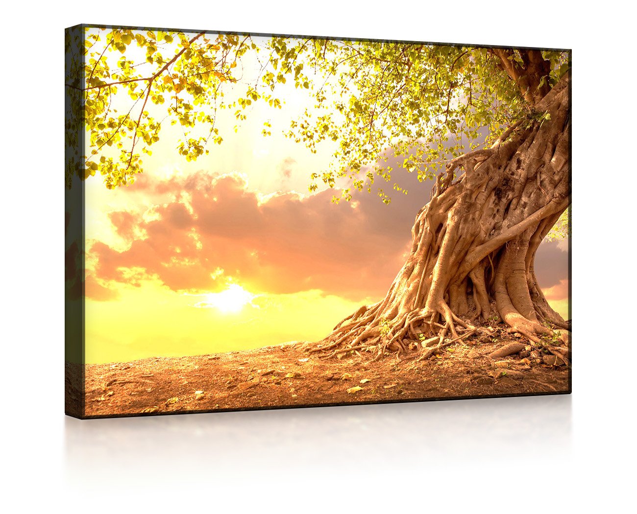 Verwurzelter starker Baum im Sonnenuntergang